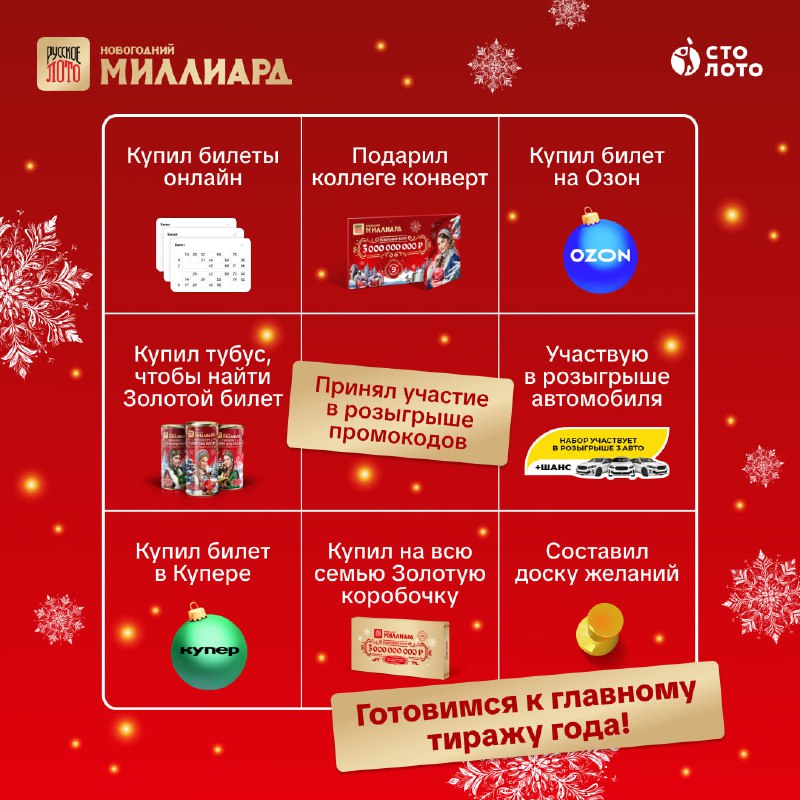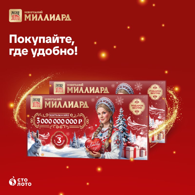 В главном тираже года разыгрываем более 3 000 000 000 ₽! Покупайте наборы билетов на «Новогодний миллиард» там, где вам удобно, и дарите себе и близким шансы на удачу!