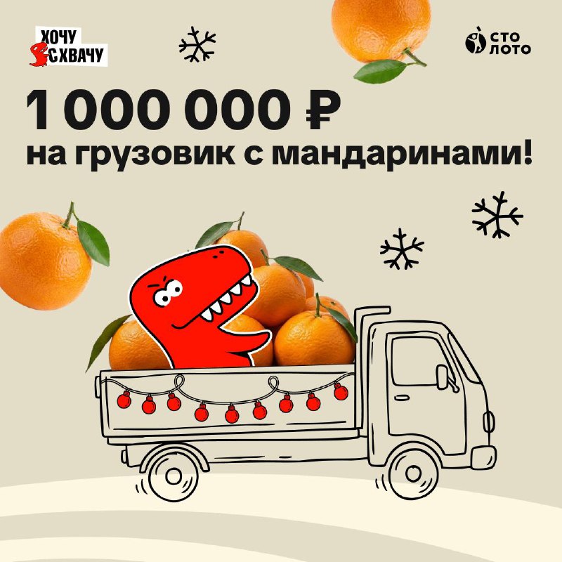 В тиражe «ХочуСхвачу» мы разыгрываем 1 000 000 ₽: ровно столько, чтобы хватило и на грузовик с мандаринами, и на коробку с апельсинами и на ощущение, будто Новый год не заканчивается!