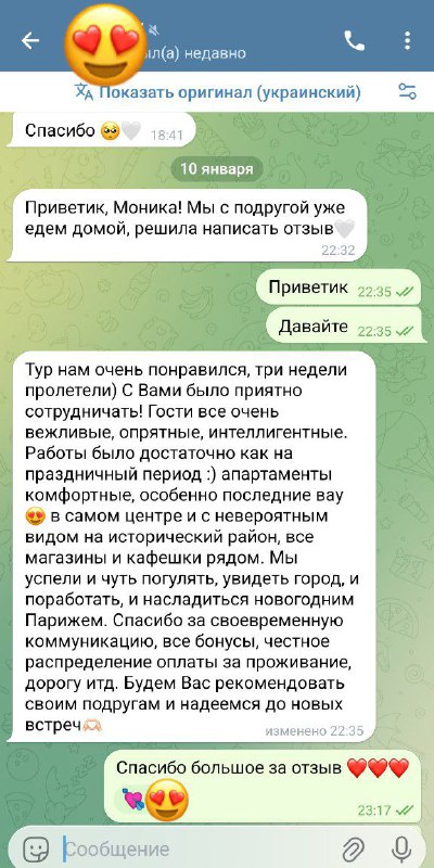 We really enjoyed the tour; three weeks flew by. It was a pleasure working with you! The guests were all very polite, neat, and knowledgeable. There was enough work to last the holiday season :) The apartments are comfortable, especially the last one, wow! right in the center with an incredible view of the historic district, all the shops and cafes nearby. We managed to stroll around a bit, see the city, work, and enjoy New Year's Paris. Thank you for the timely communication, all the bonuses, and the fair distribution of payments for accommodation, travel, etc. We will recommend you to our friends and hope to see you again.