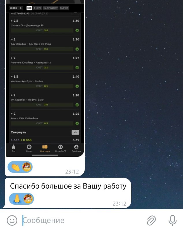 Доброе утро, друзья Для всех экспресс кф 2.23 БЕСПЛАТНО Предупреждаю что, это Кубок. Лучше Следите в Лайве! Если зайдет, ничего не жду. Как хотите! Пусть мои подписчики заработают Еще есть интересный экспресс кф 4+ Скоро тоже будет инфо об этом! Подключаем…