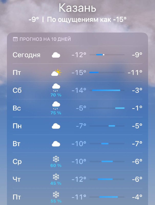 Понижение температуры воздуха до -27° ожидается завтра в Казани.