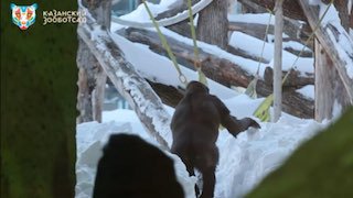 Периодически гориллам из казанского зооботсада открывают доступ на улицу, некоторые выходят подышать воздухом и вот их реакция на снег. При этом у них есть возможность в любое время вернуться в теплый вольер.
