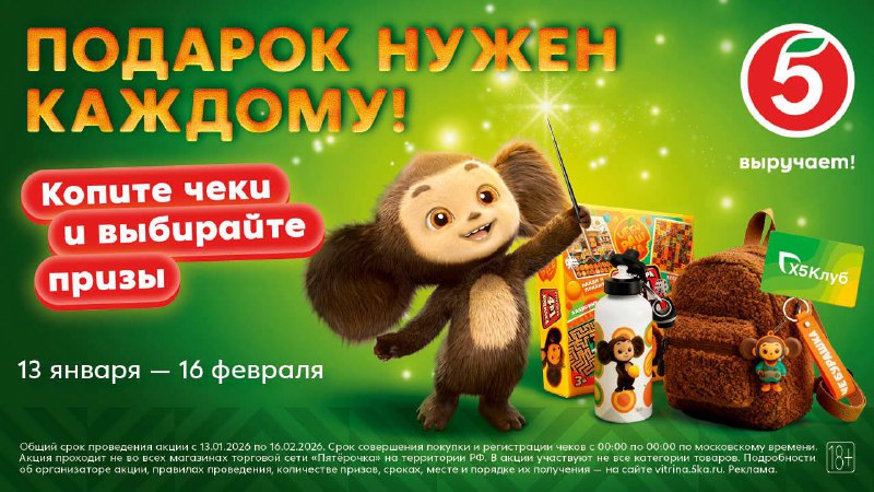 Готовы превратить обычный поход в магазин в возможность получить за это подарки? С 13 января по 16 февраля «Пятёрочка» запускает душевную акцию «Подарок нужен каждому!» с Чебурашкой.