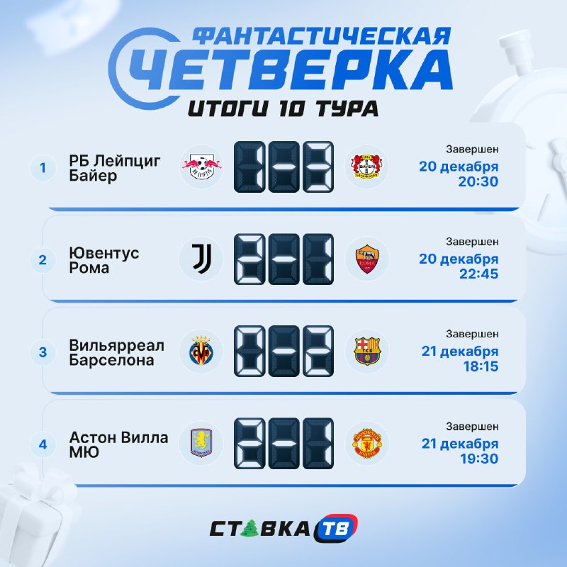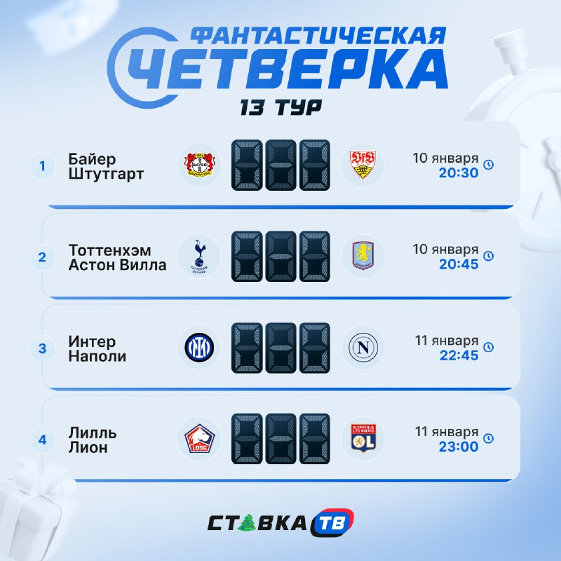 Сезон «Фантастической четверки» завершится 24 мая 2026 года, а 13 тур уже начался — оставляй свой прогноз на четыре представленных матча прямо сейчас Прогнозы принимаются до 10 января, 20:00 по МСК.