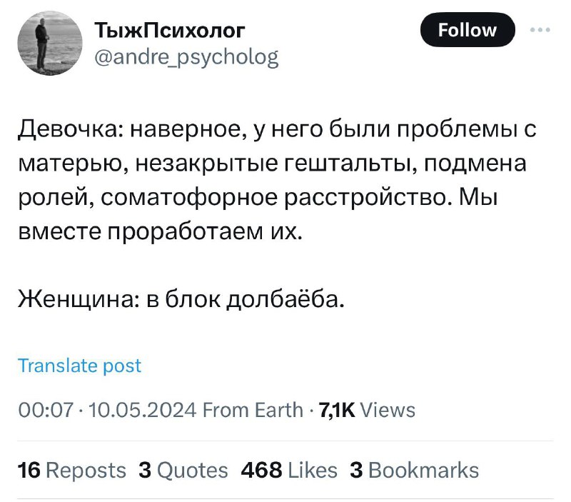И нет, я не запрещаю отношаться, если у вас проблемы с кукухой. Я призываю подумать о том, не ищете ли вы в партнере замену психотерапевту, и не иссушать морально человека, если у него по отношению к вам благие намерения, или не падать в ловушку, если у человека намерения не очень.